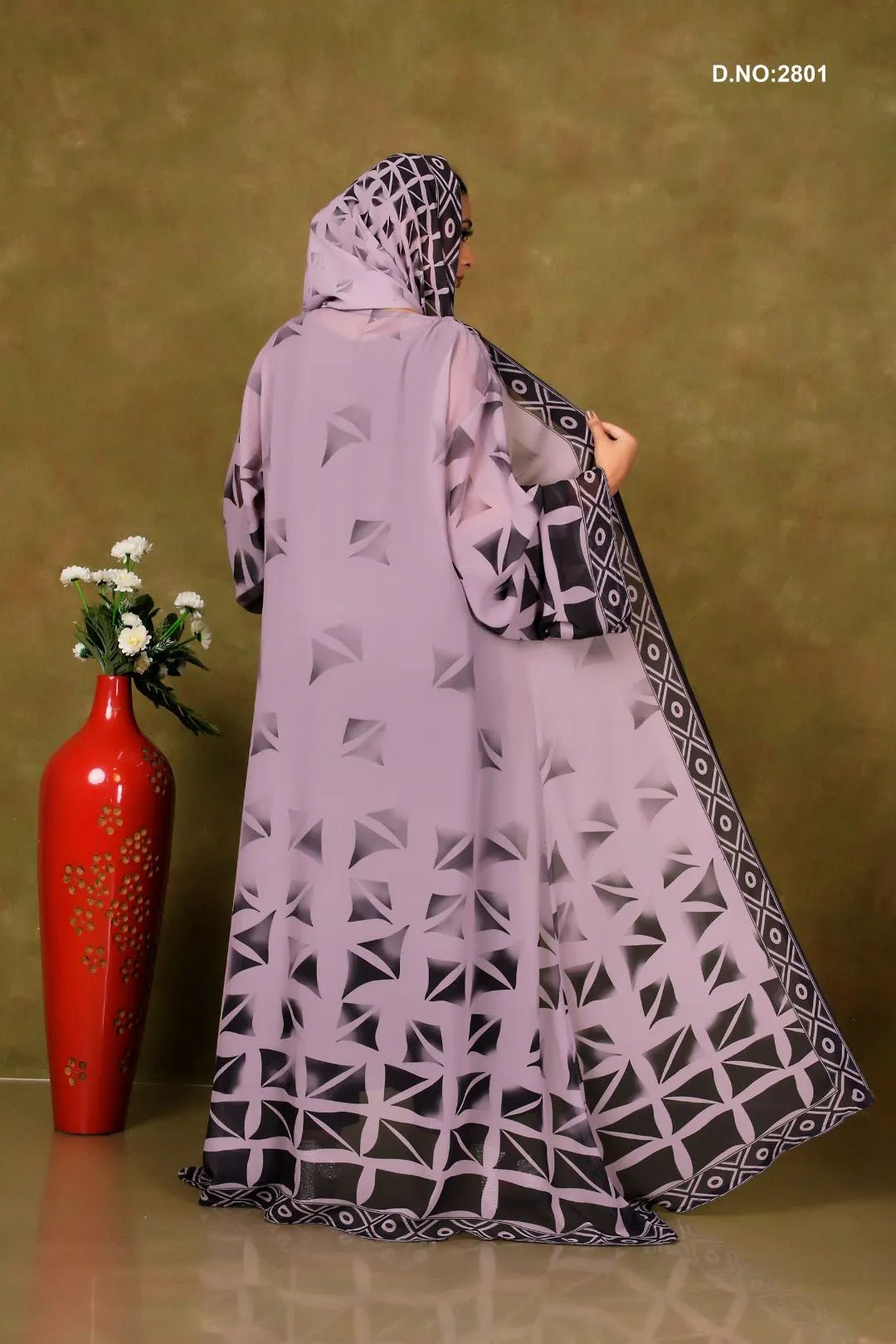 A modern twist on tradition, this flowing Weightless Chiffon shrug pairs soft lavender hues with bold black-white geometric patterns, creating a striking silhouette with cultural finesse.