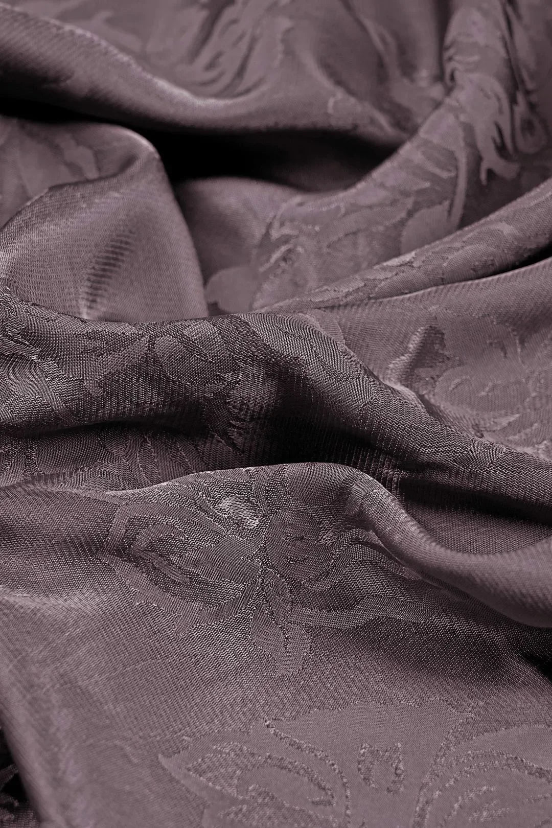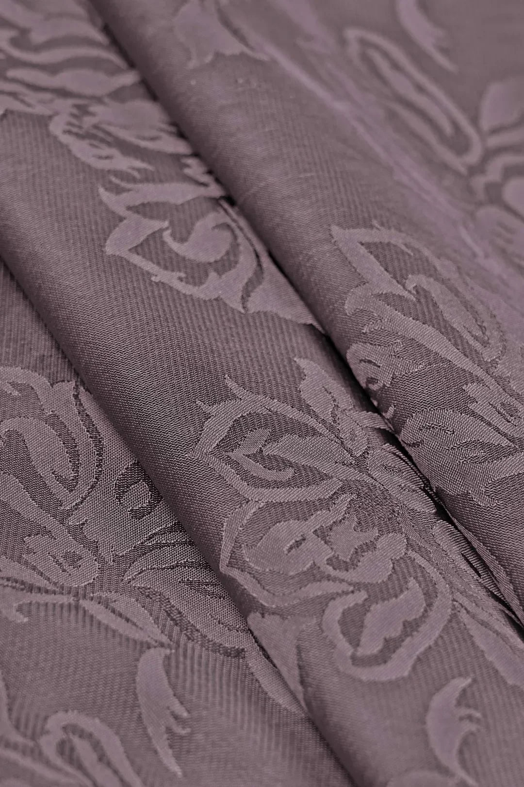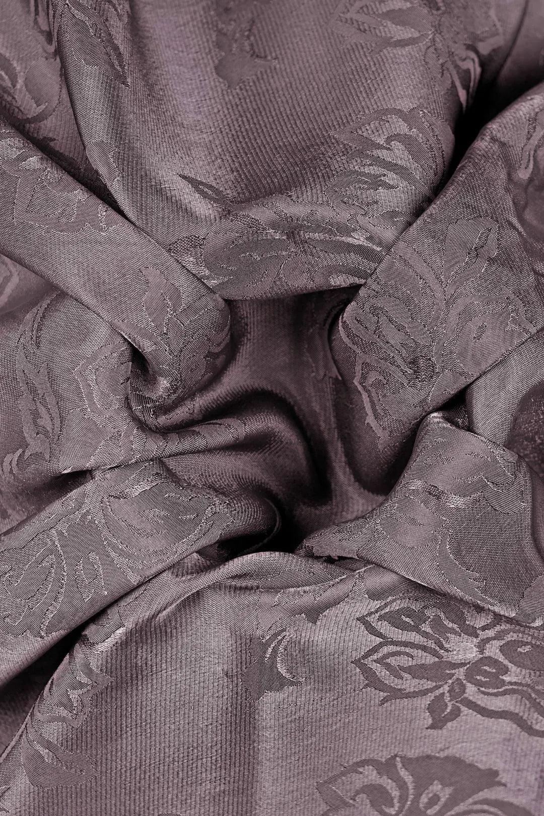 This sophisticated woven Jacquard Fabric For Women features a dense, monochromatic damask pattern in muted dusty mauve, plum, or grey-purple. The large-scale floral and foliage motifs add a tonal, elegant texture, perfect for formal jackets, structured skirts, or gowns.