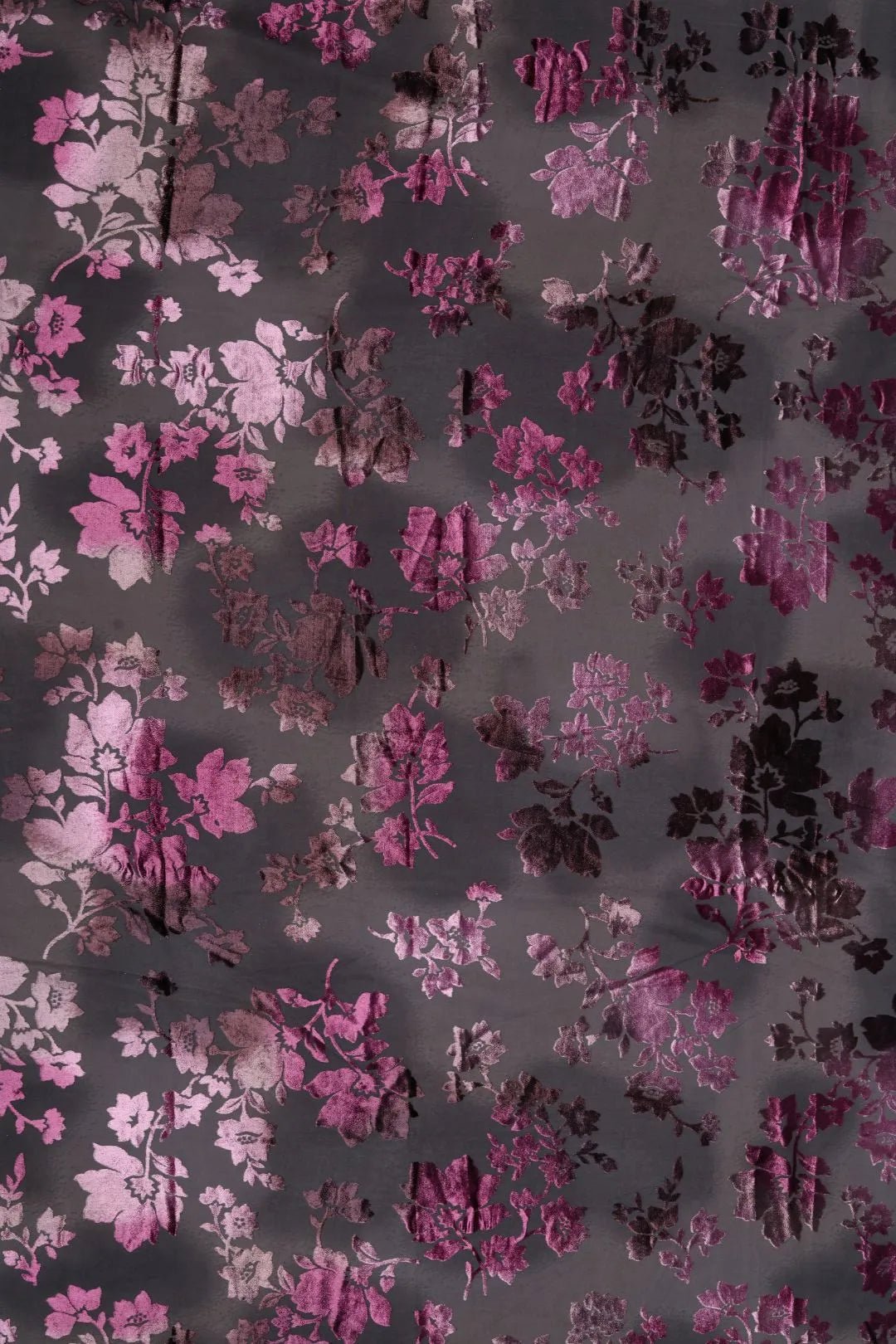 This luxurious Brasso velvet fabric features a two-toned floral design on a sheer charcoal base. The plush crushed velvet in fuchsia, magenta, and mauve creates a rich, feminine, and statement-making texture.