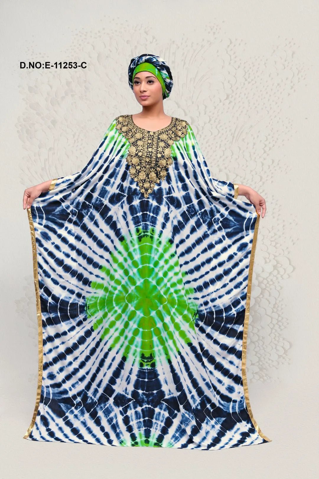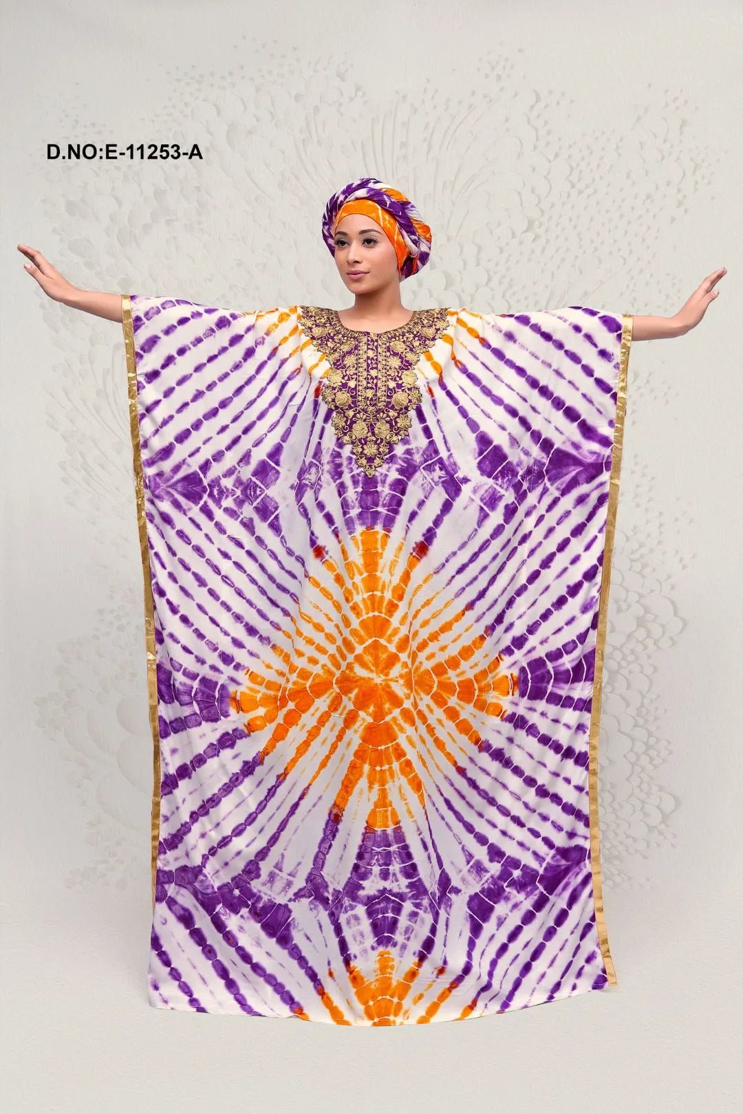 This captivating garment is a full-length Farasha Kaftan or kaftan-style gown defined by its voluminous, free-flowing cut and centralized graphic pattern.