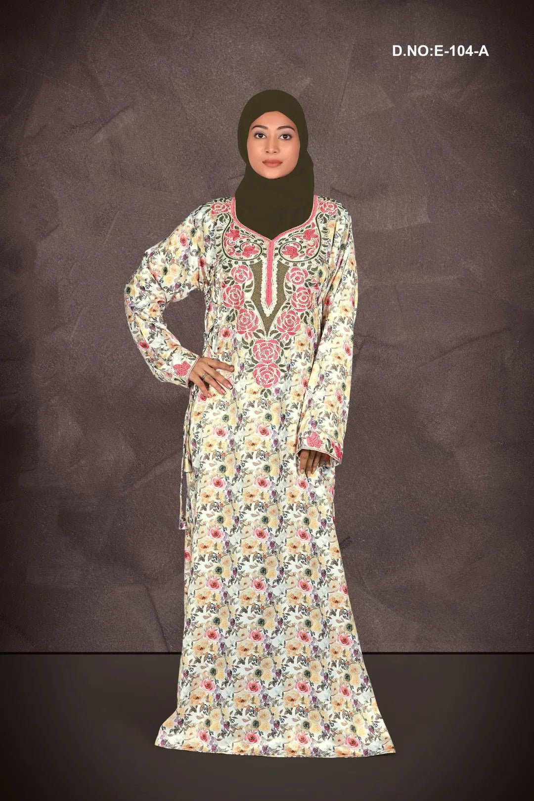 This graceful Jalabiya is made from smooth baby satin fabric, offering a soft texture and elegant fall. Featuring an all-over floral digital print with a beautifully highlighted neckline design, it delivers a perfect balance of comfort and sophistication. The straight, full-length silhouette ensures ease of movement and modest appeal.