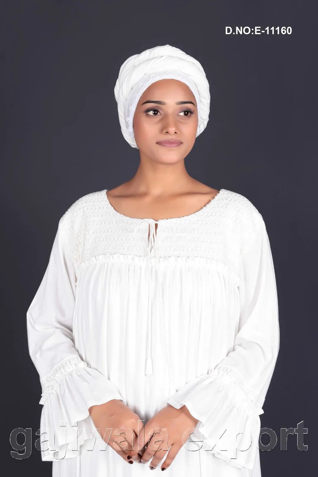 This elegant full length Long kaftan maxi dress features a soft, flowing silhouette that feels light and comfortable. Designed in classic white, it highlights a smocked yoke with delicate ruffle details at the hem and cuffs. The textured elements add a feminine, boho-chic touch, making it perfect for relaxed yet stylish summer looks.