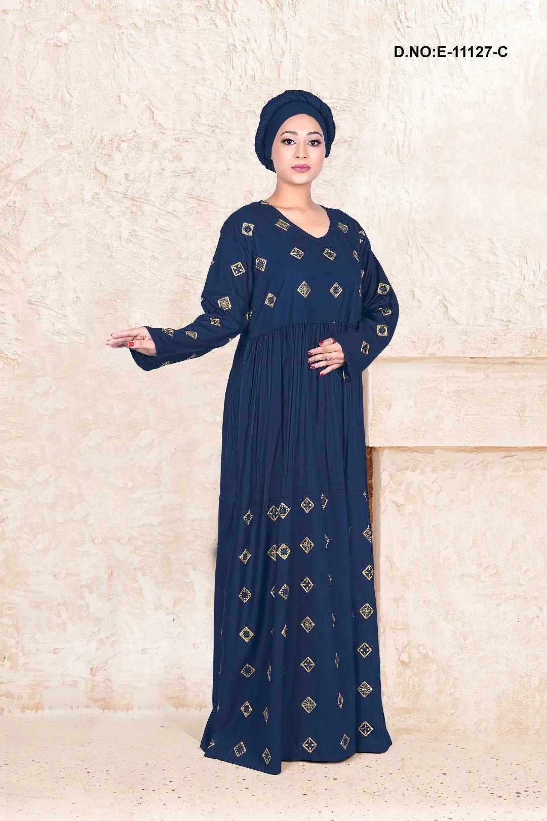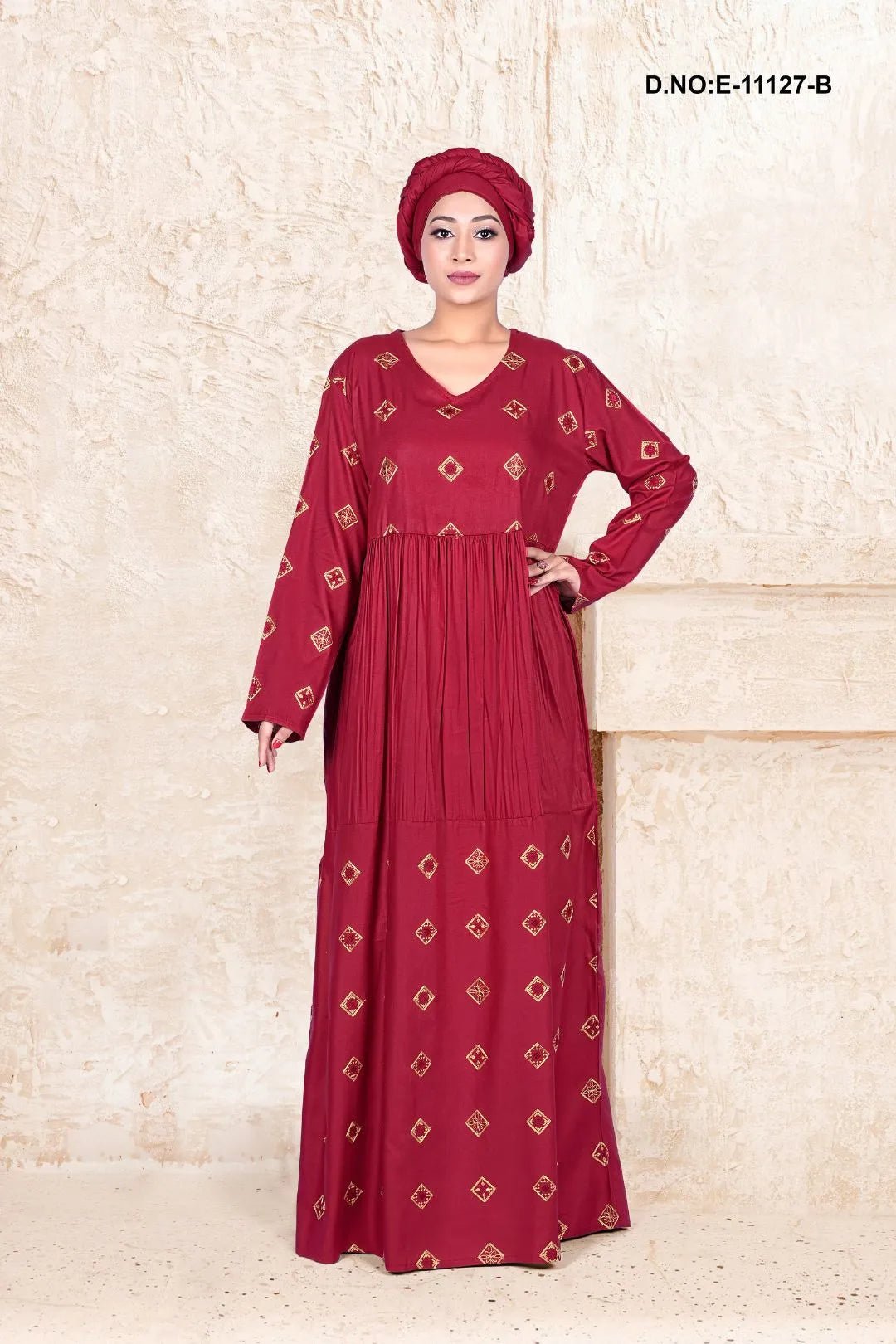 This kaftan is crafted from soft rayon fabric and highlighted with refined embroidered motifs that enhance its graceful appeal. Designed with a relaxed, flowy silhouette, it offers effortless comfort while maintaining a sophisticated modest look. Ideal for everyday elegance as well as special occasions, this kaftan blends traditional charm with modern styling.