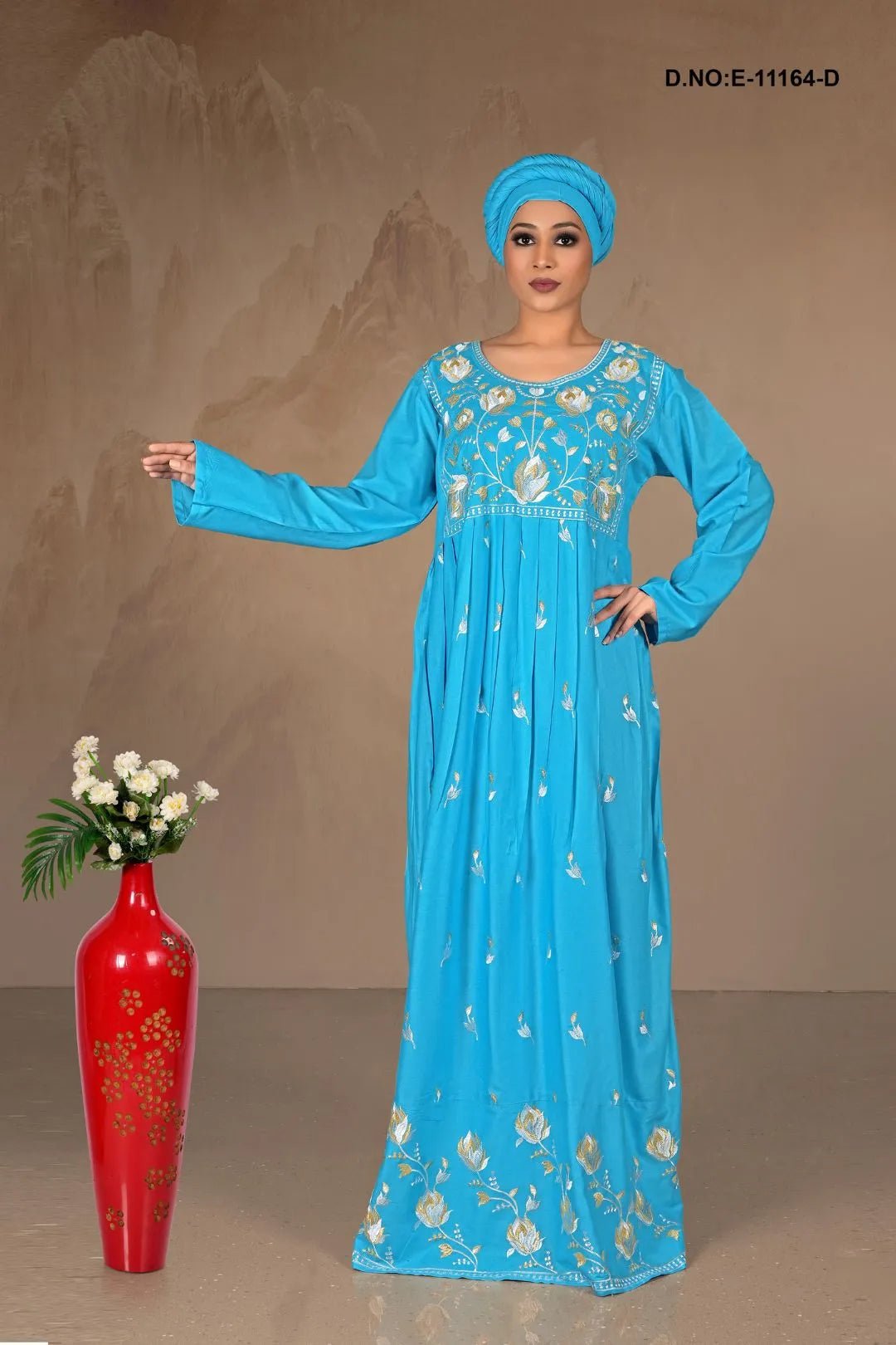 This beautiful full-length Long kaftan maxi dress features a fresh, elegant color with rich floral embroidery on the yoke. The flowing silhouette is softly gathered below the yoke, creating a graceful and feminine look. The smooth fabric combined with detailed multicolor embroidery makes this gown perfect for festive occasions and formal daytime events.