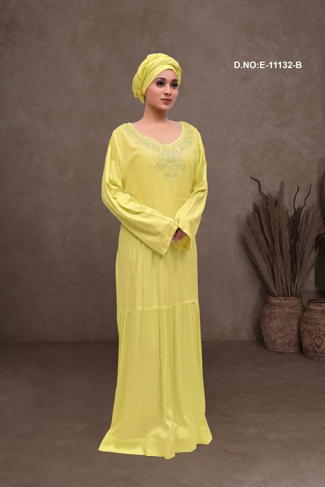 This full-length Long Kaftan gown features a tiered skirt and a flattering V-neckline adorned with tonal beadwork and crystals. The subtle woven texture adds elegance, while the flowing silhouette ensures comfort. Ideal for daytime events and semi-formal gatherings.