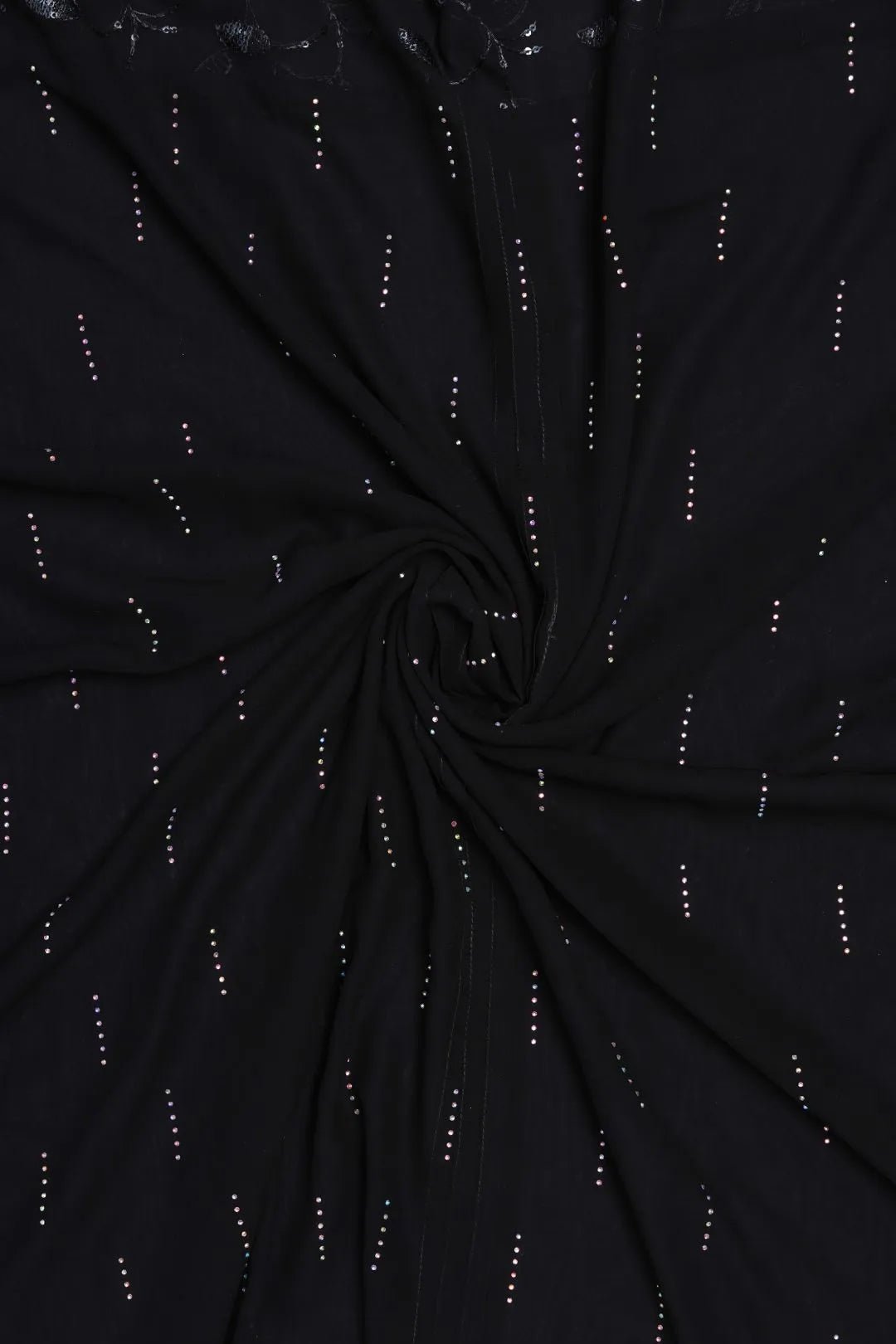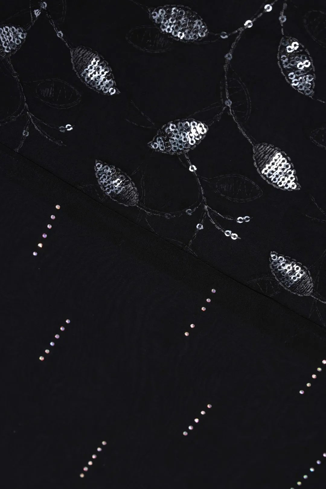 This elegant Black Stole For Women is perfect for sophisticated evening wear. Made from smooth, sheer fabric, it features subtle horizontal dashed beading and a dramatic vertical border with oversized metallic silver leaves. Ideal for formal events, black-tie occasions, or as a classic evening accessory.